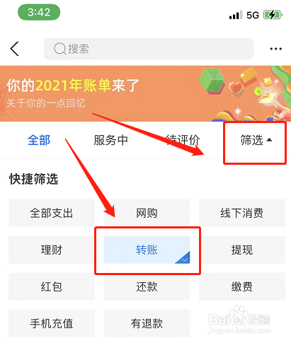 在支付宝账单页面,快速筛选转账即可查转账记录,总共分三步,以下是具体的操作步骤: