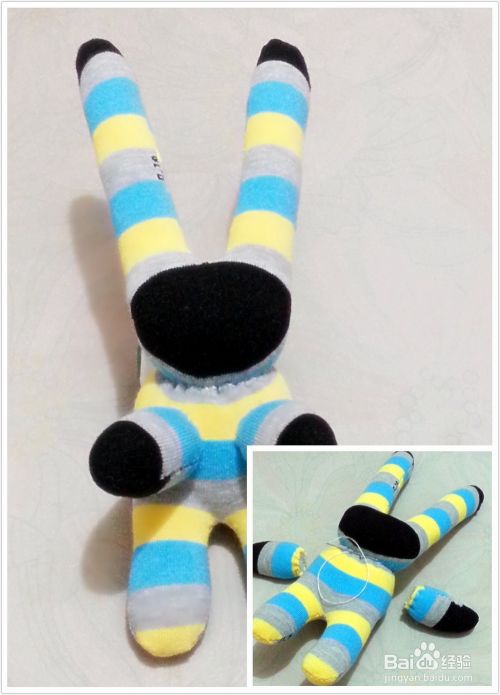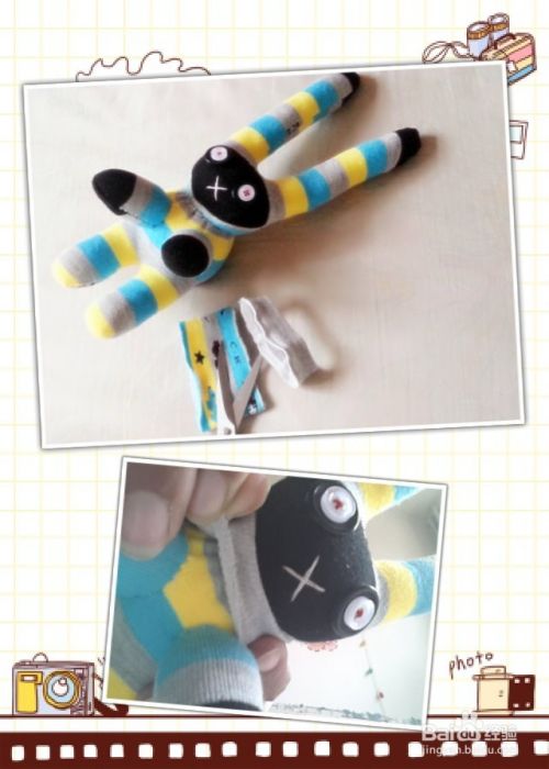 所以的步骤都完成后一个可爱的玩偶就出来了,是不是觉得还有点不够完美呢?没错仔细看玩偶是很可爱可是我们在做玩偶时缝合的接口还显现在外哦,使得整个做工显得很粗糙是吧,那么好吧,找一下把我们刚刚裁剪时丢弃的袜筒(袜庄)部分拿出来再次裁剪,将袜边剪下来,一定要剪得平整哦,然后套在玩偶的脖子上给它加个小围脖,怎么样是不是活起来了呢!