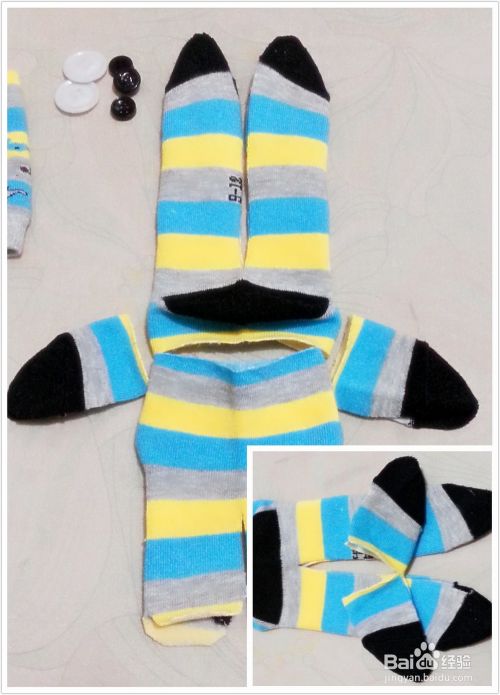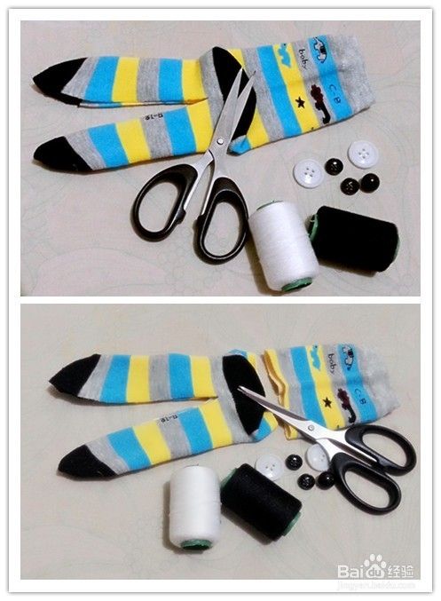准备好使用的各种材料,袜子一双,纽扣4颗,棉花,针线,剪刀,尺子,笔(小细节可根据个人喜好准备)