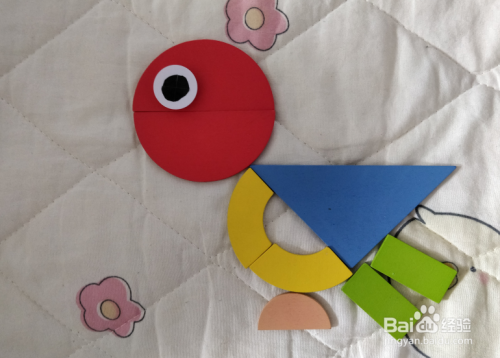 在红色半圆形的左侧,放上两个右端挨着的半圆形挨着,如图。一只带三角形的鸟就出来了。