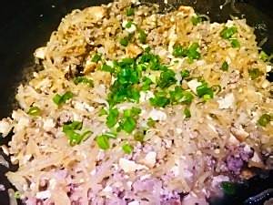 放入豆腐炒均匀,放适量生抽、盐,几滴老抽上色,放少许糖调味,最后加入葱花,如果有大蒜叶加入会更好