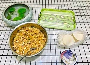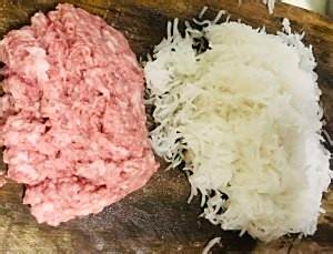 白萝卜把皮刨了,擦丝,放少量盐腌制,把夹心肉剁成未,留点肥肉颗粒炒的时候会香点。萝卜丝会有很多水分出来,挤干水分,剁几刀
