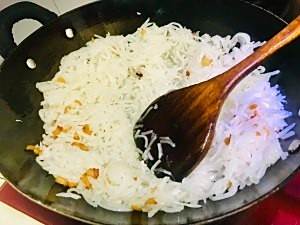 锅内先肥肉先炒一下,炒香,放入萝卜丝翻炒,再放入肉末炒。