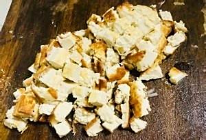 腌萝卜丝的同时开始煎豆腐,煎到二面金黄,豆腐切碎