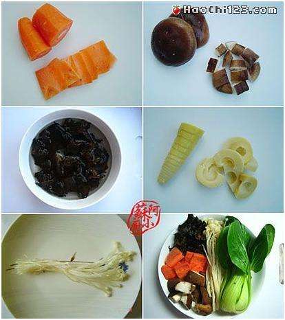 2香菇切块,胡萝卜、春笋切片,金针菇、油菜洗净;
