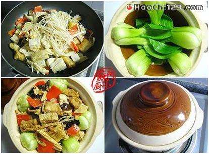 4砂锅中铺上油菜,将炒好的材料倒入,小火焖20分钟,最后淋一点点麻油提味,即可。