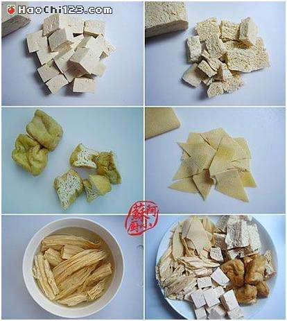 1白豆腐,油豆腐,冻豆腐,豆腐皮切小块,腐竹用凉水泡软,切段
