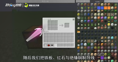 然后,我们把铁板,红石与绝缘铜制导线放入工作台的合成框中