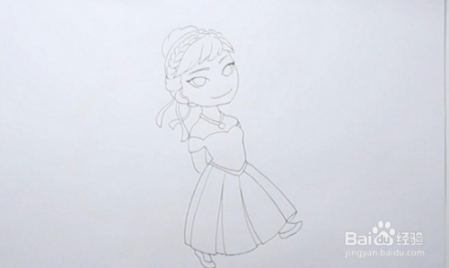 下面画上安娜戴着项链的脖子,安娜的两只手是背到身后的,接着画出安娜的抹胸裙子,注意画好裙摆的线条,再画上双脚就可以了。