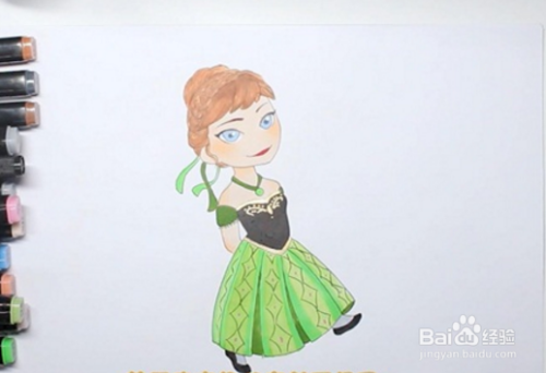 最后,将项链和两边的袖子涂成绿色,上半身用黑色来涂,再用金色高光笔描边、画花纹,裙摆我们涂成绿色,然后画上菱形的花纹,优雅的安娜公主就画好啦。