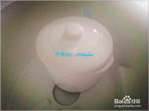 准备一个平常吃饭的陶瓷碗,加入凉白开,大概平齐一碗,然后倒入炖盅中,浸泡10分钟左右。