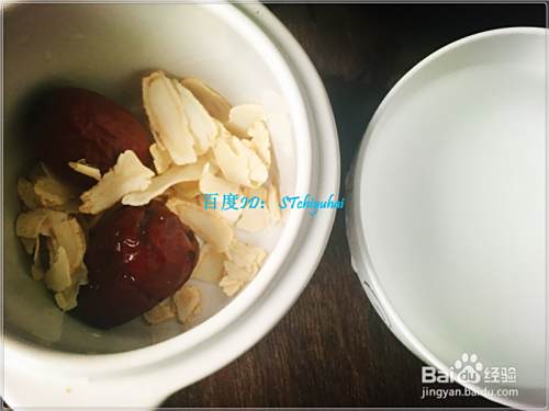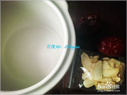 准备主要的材料和工具,一小包洋参切片、两个大红枣、一个隔水炖盅。