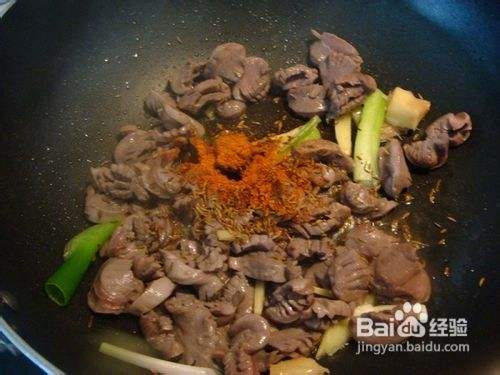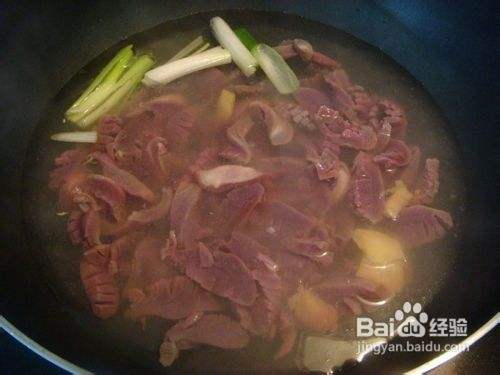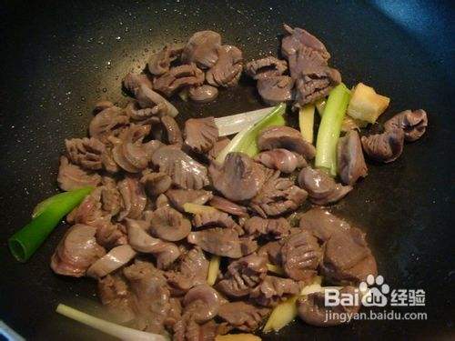 另起锅热油将处理好的鸭胗,姜葱放入锅里爆炒。