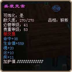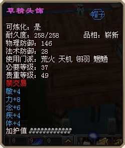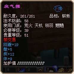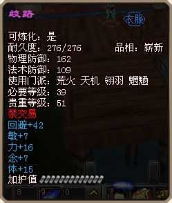 装备等级39级,适合荒火,天机,翎羽,魍魉4大门派装备,属性比较中性4门派都可佩戴