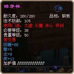 装备等级38级,适合8大门派使用,其中以法术系门派最适合装备