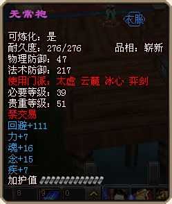 装备等级39级,适合太虚,云麓,奕剑,冰心4大门派使用,属性比较中性4门派都可佩戴