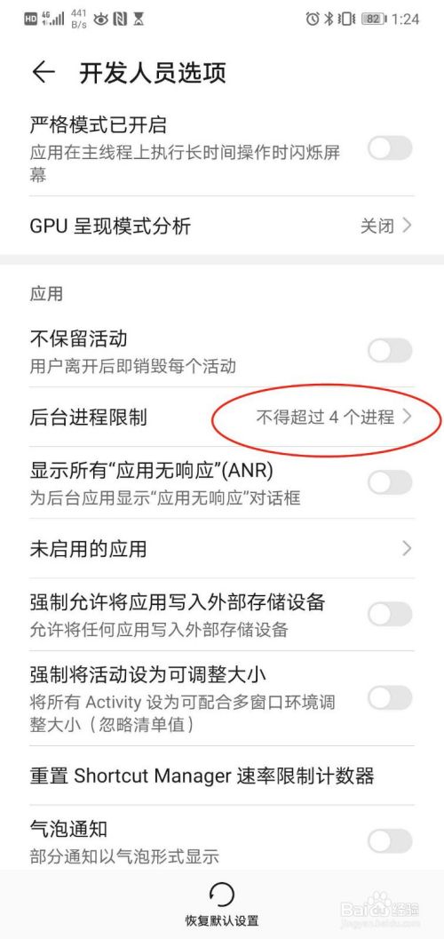6.继续下拉,找到“后台进程限制”,修改为“不得超过4个进程”。
