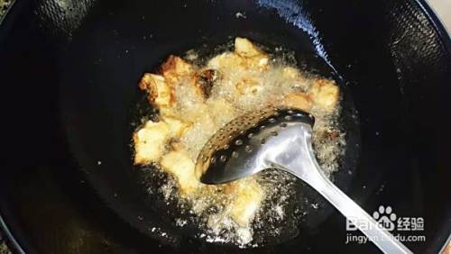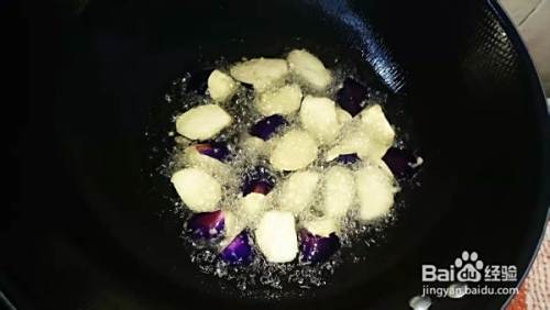 热锅倒油,油量多些,把茄子和腌好的鱼块分别下去炸至金黄后捞出控油。