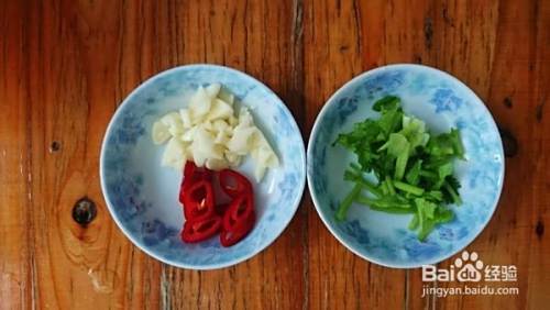 蒜头,红辣椒和香菜切好备用,并用白砂糖,香醋和生抽调点料汁。
