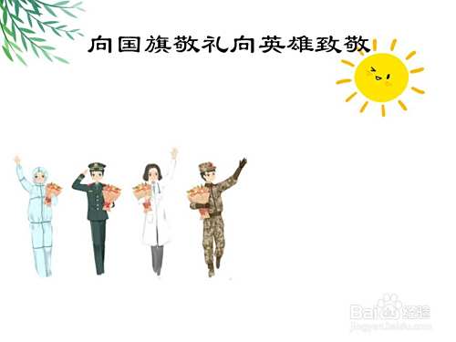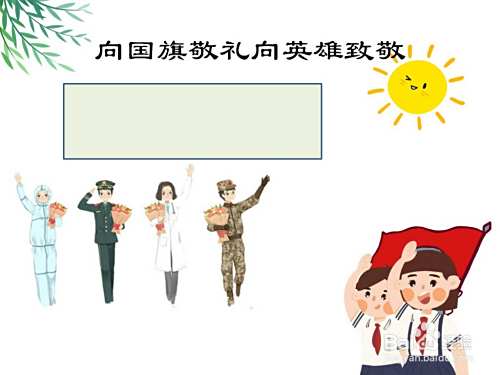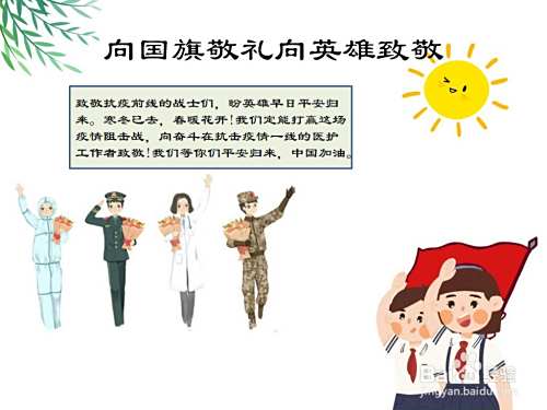 在右下角画两个少年在国旗前敬礼,并向抗疫英雄们致敬,感谢他们的无私奉献,用来呼应主题。