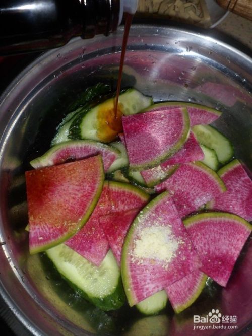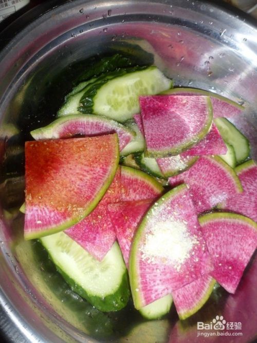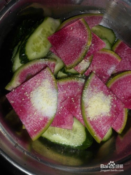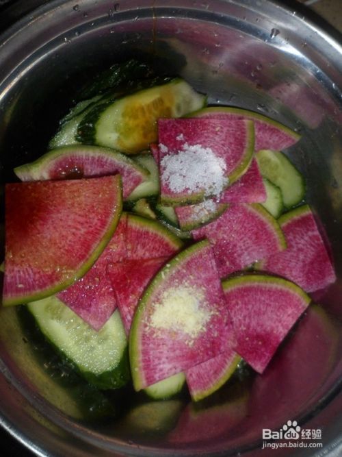 把黄瓜和萝卜放一起,放适量的盐和鸡精。