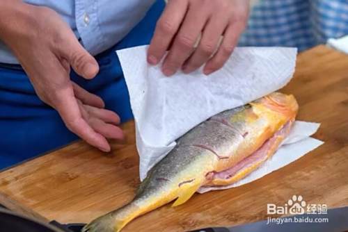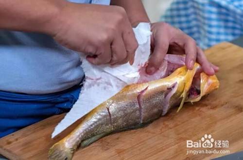 将黄鱼肚打开,用纸吸干红色血水,这就是腥味的来源。
