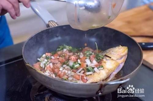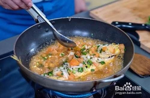 用勺将番茄配料不断淋到鱼上,这样做不用翻动鱼也会入味,然后盖上锅盖,煎蒸片刻。