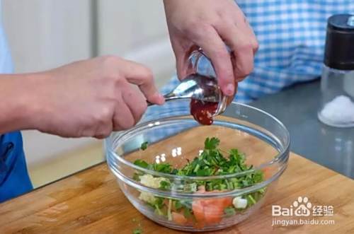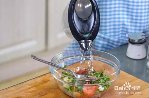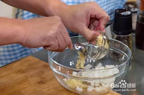 在水晶碗中放入适量切好的洋葱丁和一勺蒜末。