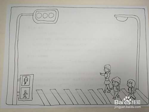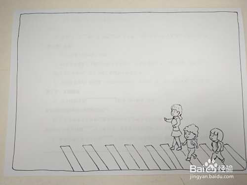 在手抄报边框的右下角绘制老师带领孩子过斑马线的场景