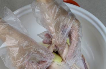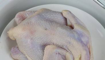 将全鸡清洗干净,放入锅内,里外均匀抹上盐和料酒,葱段姜片塞入鸡肚子里,盖上盖子腌制12个小时