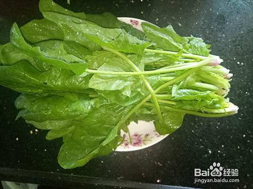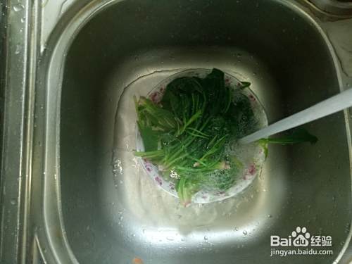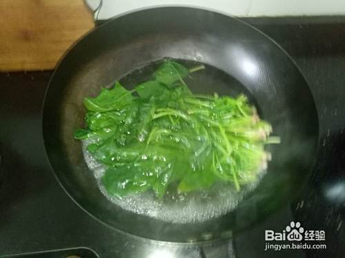 锅内放入适量水,烧开,将菠菜开烧烫一下,为保持其颜色不变黄,立刻用自来水冲凉。因菠菜含草酸钙,不利营养收收,热水烫可以减少其含量。
