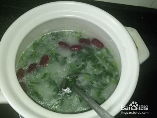 熬好的粥内加入适量的盐,食用油,倒入切好菠菜,煮开。