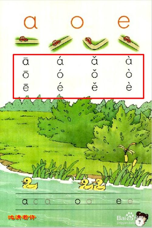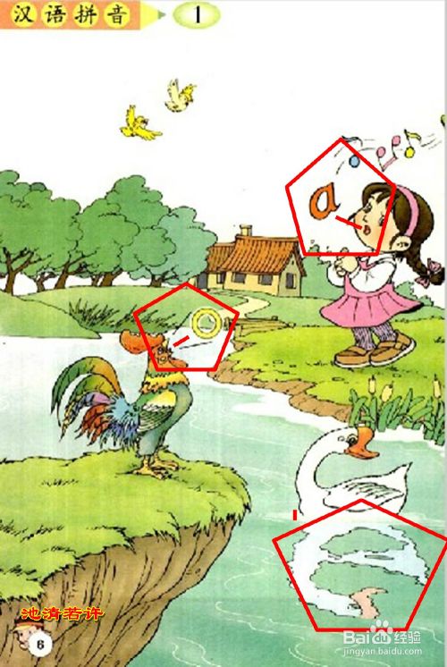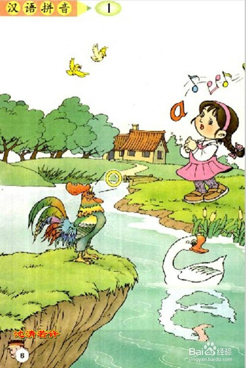 辅导读音。根据小女孩的“啊啊啊”的唱歌声,教孩子读“ɑ”。根据公鸡打鸣,教孩子读“o”。根据水面的大白鹅,教孩子读“e”。