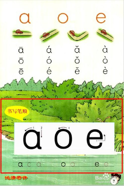 指导孩子书写ɑ、o、e。首先认识四线三格,它共有四条线,三个格。ɑ、o、e书写在中格里,要写得饱满,即上下抵线。笔顺:ɑ,先写左半圆,后写竖右弯。o,从右上角开始写起,向左向下向右向上封口。e,从中间的横画写起,不间断地向上、向左、向下、向右,再略略向上,不要封口。