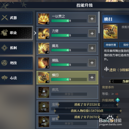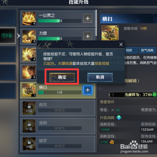 如果我们的技能经验不够,可以用升级经验来补上点击确定用来升级。升级技能会消耗交子跟技能经验或升级经验。