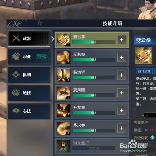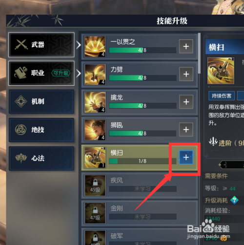 技能分为武器,职业,机制,绝技,心法。点开对应的分类就可以升级对应的等级。