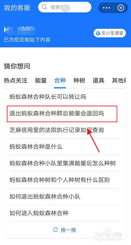 进入帮助之后,选择“合种”在选择“退出蚂蚁森林合种群后能量会退回吗”,如图所示