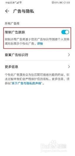 进去之后,开启限制广告跟踪,就关闭广告推荐了。