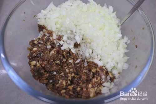 剁好的洋葱丁拌入肉馅中,搅拌均匀即可。