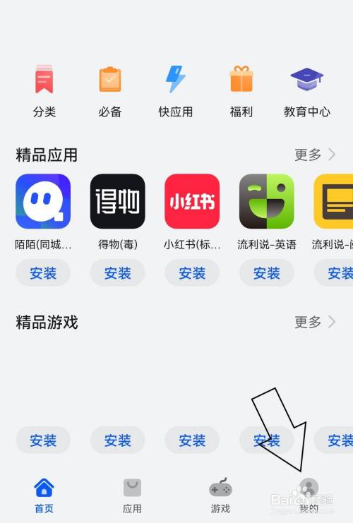 应用市场的首页中点击我的选项。