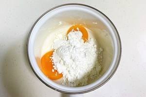 往奶锅奶加入两个蛋黄、糖粉和玉米淀粉。