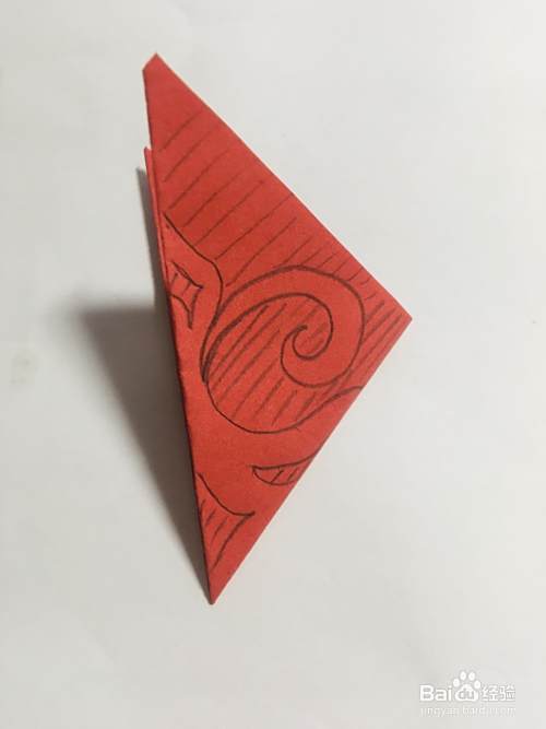 在折好的纸面上画一个三角形花芯带卷纹边的托叶,以及阴影部分。
