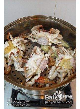 梭子蟹洗净,放入上汽的蒸锅蒸12分钟至八成熟,取出凉至不烫手后揭去蟹盖留用,撕掉蟹鳃、蟹脐,然后将蟹身切成4块。蟹钳用刀拍破。