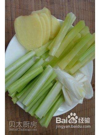 大葱切段。莴笋、西芹分别切成手指粗细的寸段。老姜切片备用。