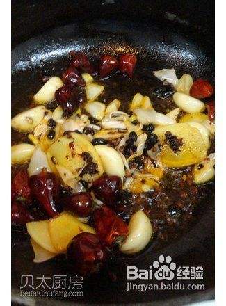 大火加热炒锅中的油至6成热,放入花椒、干灯笼椒、大葱段、老姜片和蒜爆香,放入红油豆豉辣酱翻炒出红油。