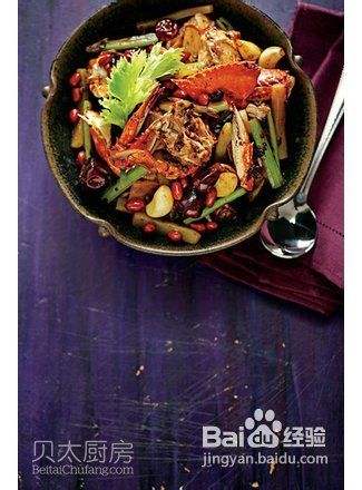 新鲜螃蟹和爽脆蔬菜为伍,香麻红艳的一盘端上桌,从四川空降的美妙滋味让人吮指难忘。