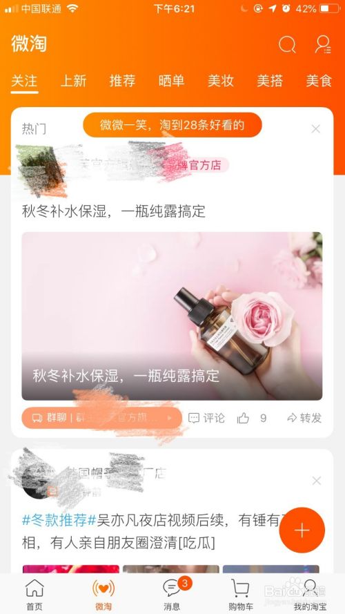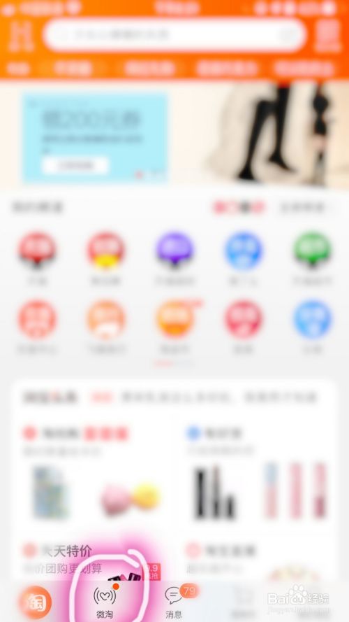 首先进入手机淘宝,首页下方进入“微淘”页面