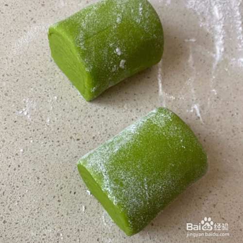 撒点干粉,搓圆、搓长,切下两边不均匀的部分,平均分成5份;切下的部分揉成圆形;