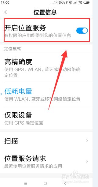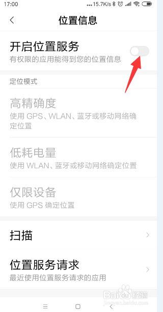 如图所示,在位置信息的主界面找到【开启位置服务】选项,将右边的按钮关闭。