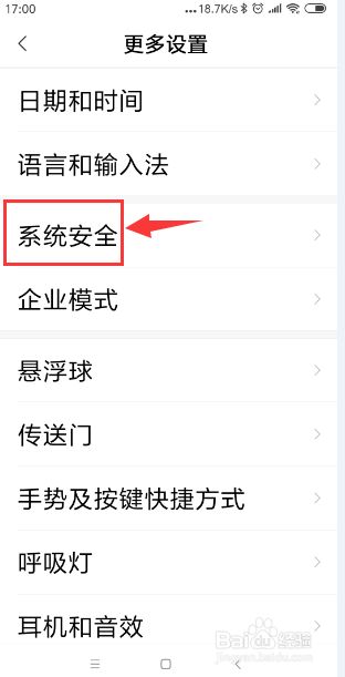 如图所示,在更多设置的主界面,找到【系统安全】选项,点击打开。